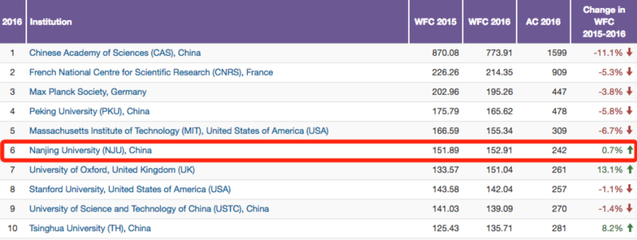 The index of Nanjing University increased by 4.4% (252.44 - 263.67) from 2015 to 2016, and this year, its rankings have also steadily improved (in 2016, Nanjing University ranked the 25th among global scientific research institutions, the 20th among world universities, and the 4th among the Asia-Pacific universities).