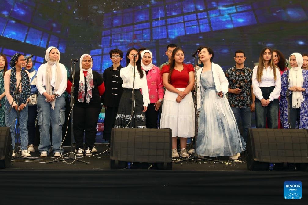 Students and teachers perform a song during a ceremony to celebrate Chinese Language Day in Cairo, Egypt, April 27, 2024. Students studying in Egyptian colleges celebrated Saturday the United Nations Chinese Language Day with a themed event featuring a concert, food and tea tasting, sketch comedy, and art show. (Xinhua News Agency/Ahmed Gomaa)
