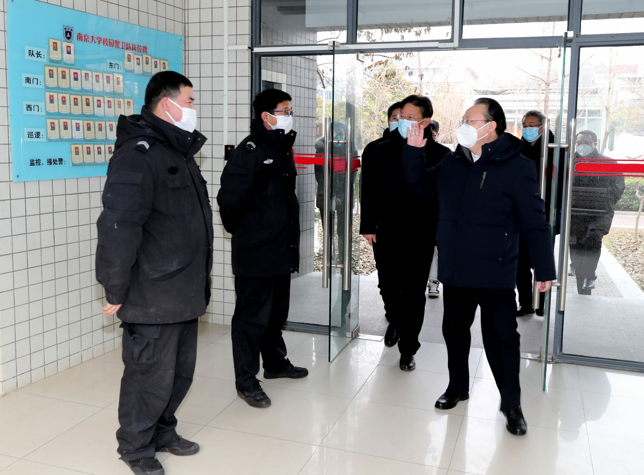At the 110 Alarm Center of the campus security office, Tan learned of the daily routine of the staff and inspected the campus scenes through real-time CCTV monitoring. Tan inquired about the health of the staff on duty, expressed sincere thanks for their hard work, and pointed out that “Nanjing University is worth protecting by us all”. In such a special time, he hoped that everyone will continue to effectively safeguard the campus.