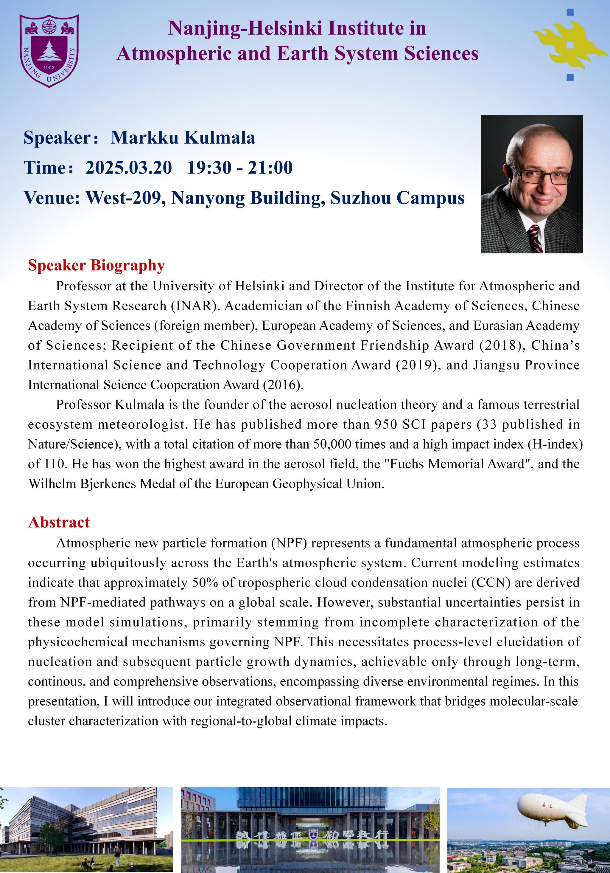 Professor Markku Kulmala will visit NJU Suzhou campus and give a lecture at Nanjing-Helsinki Institute in Atmospheric and Earth System Sciences.