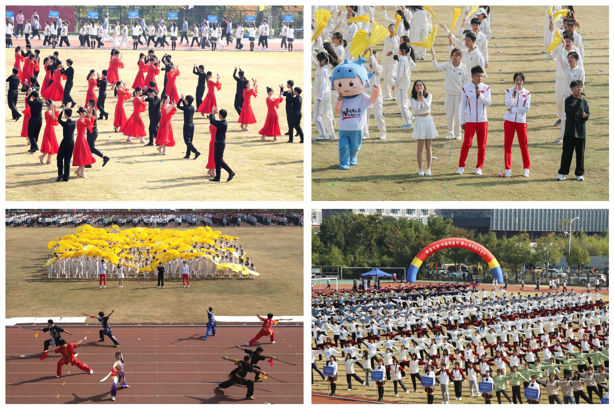 在杭州第19届亚运会、成都第31届世界大学生夏季运动会上摘金夺银的凯发健儿李玉婷、隋高飞与校园十大歌星代表领唱《凯发k8官网校歌》。体育舞蹈班一曲《Last Tango》舞动全场,传统武术舞刀表演气势如虹,啦啦操青春靓丽、动感活泼。广播操表演中,同学们一招一式整齐有力;数百名同学手持彩扇,舞动红绸,呈现“凯发奋进”字样,打出“团结奋斗,争先进位,坐言起行,应势而动”的口号,鼓舞全体凯发人以奋进之姿共赴新的赶考之路。