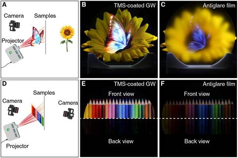 最后,图3展示了基于透明哑光表面的一种新透明显示方案,即把透明玻璃变成显示屏。透明哑光表面的漫反射类似于电影院的幕布功能,可以投影显示。再结合高透明性,就实现了透明显示。图3A展示了实验设置。样品的后侧放置了一支向日葵,投影仪将彩色蝴蝶投影到样品的前侧,并在同一侧用相机拍摄。图3B展示了样品为透明哑光表面时拍摄的照片。显然,投影的蝴蝶和样品后面的向日葵都非常清晰。作为对比,如果用防眩光膜替代了透明哑光表面(图3C),此时蝴蝶明显暗淡了许多,同时向日葵也变得十分模糊。有趣的是,基于透明哑光表面的投影显示还具有单侧显示的特征。图3E展示了投影彩色铅笔时从前后侧分别拍摄的照片,可见前侧铅笔十分清晰,而后侧则几乎看不清铅笔。这再次验证了极端不对称的光散射。作为对比,使用防眩光膜时(图3F),前后拍摄到的铅笔亮度相近,意味着防眩光膜中的光散射在前后都存在。