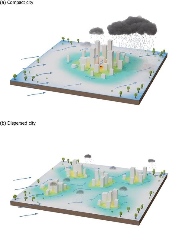 图2 不同城市扩张方式影响降雨的概念模型。(a)紧凑型,在市中心及下风向产生降雨(b)离散型,在郊区产生降雨。阴影颜色表示城乡热力差异,暖色表示更高的地表温度,冷色反之。箭头表示气流的速度和方向。