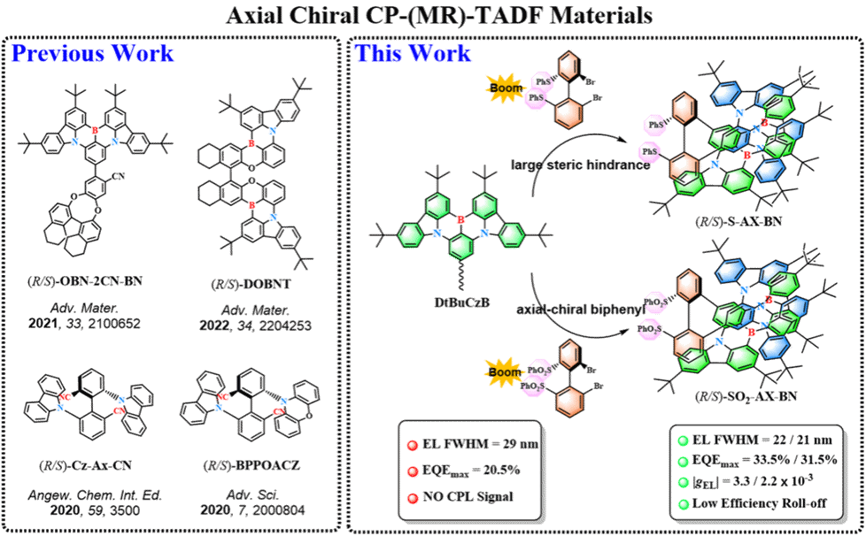 由于手性多重共振热激活延迟荧光(CP-MR-TADF)材料具有高量子产率、高色纯度,并能直接实现圆偏振发光(CPL)的特点,在制备圆偏振有机电致发光器件(CP-OLED)以及3D显示中有重要的应用前景。然而,在MR-TADF的刚性骨架中引入手性源,容易引起发射光谱的展宽。并且由于手性源与发光中心的分离,CP-MR-TADF的CPL性能往往不尽人意。
