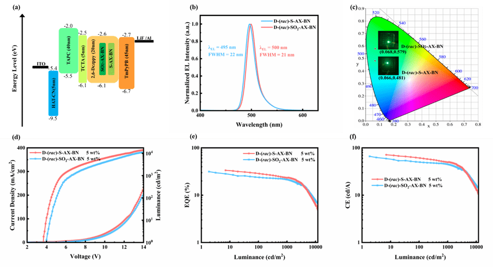 基于S-AX-BNSO2-AX-BN制备的CP-OLED器件D-(rac/R/S)-S-AX-BN和D-(rac/R/S)- SO2-AX-BN在495和500 nm处展示出极窄的电致发光(FWHM=22, 21 nm),在基于目前已知CP-MR-TADF的器件中属于最窄的,并展示出33.5%和31.5%的最大外量子效率(EQEmax)与较低的效率滚降。更重要的是,它们分别获得了稳定且镜像对称的圆偏振电致发光(CPEL)光谱,其|gEL|分别为3.3×10-3和2.2×10-3,是该领域轴手性同类CP-MR-TADF材料中的最高值。