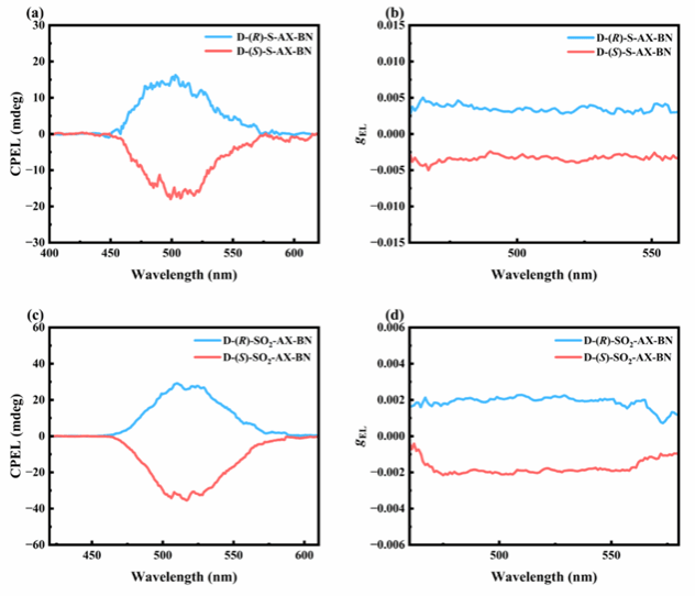 4. CP-OLEDs性能:(a), (c) CPEL光谱; (b), (d) gEL-波长曲线。
