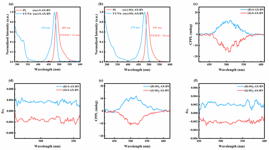 在甲苯溶液中,S-AX-BNSO2-AX-BN最大发射波长分别为489和495 nm,半峰宽(FWHM)分别为21和20 nm。由于轴手性源与发光中心的良好结合,(R/S)-S-AX-BN与(R/S)-SO2-AX-BN在溶液中呈现出镜像对称的CPL光谱,不对称因子|gPL|为2.2×10-3和1.4×10-3。在薄膜中,其同样表现出镜像对称的CPL光谱,|gPL|分别为3.5×10-3和2.3×10-3