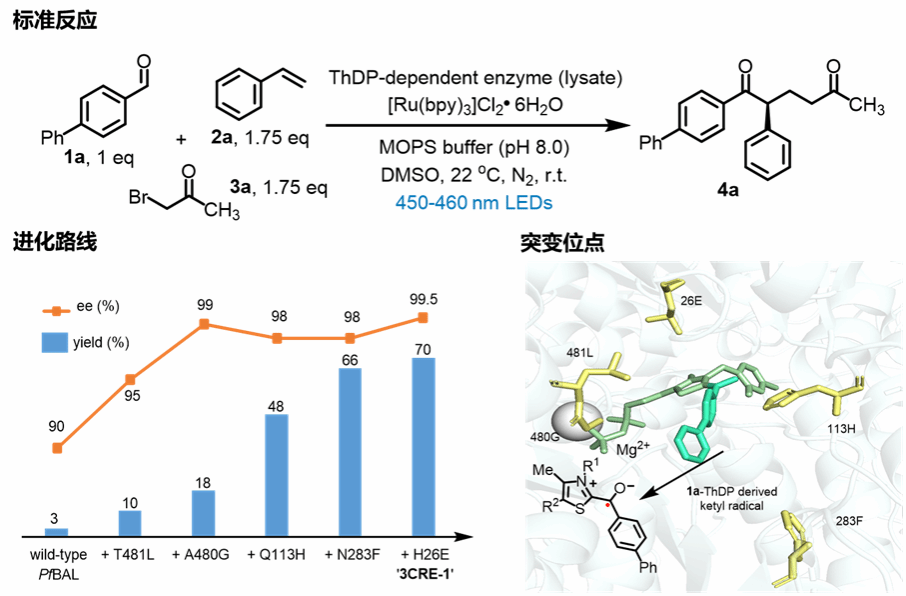 团队选取4-苯基基苯甲醛(1a),苯乙烯(2a)和溴丙酮(3a)作为模板底物,探索了[Ru(bpy)3]Cl2?6H2O和ThDP依赖酶的催化体系。随后通过分子动力学模拟和半理性的迭代位点特异性突变策略对酶进化改造,团队发现T481L,A480G位点突变对反应的对映选择性有一定提升,Q113H,N283F位点对反应的收率有显著提升,最终通过五轮突变获取了最优的突变体(图2)。