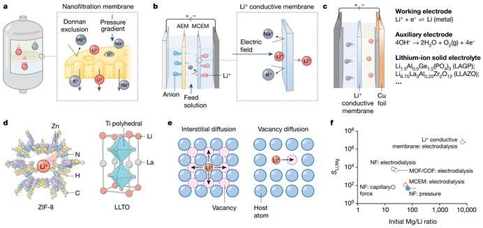 基于膜的分离技术通过调节膜的孔径和表面功能化,使得锂离子能够在复杂溶液中优先通过,而其他离子则被排除。文章回顾了膜分离技术在锂提取中的应用进展,特别是利用膜的孔径和表面功能化调控离子的选择性渗透,能够有效地分离低品质卤水中的锂离子。此外,作者特别强调了电场作为膜分离驱动力在构建多级分离系统和利用锂离子固态电解质进行分离上的优势,同时也指出了其在大规模应用中的成本和能耗问题仍需进一步解决。