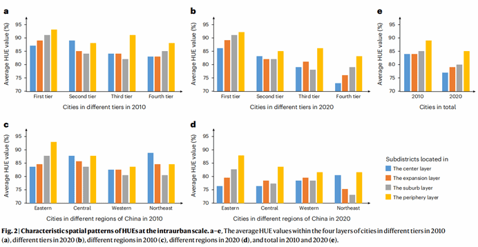 图2|城市内部尺度住房利用效率(HUE)的特色空间模式。a–e.不同层级城市2010年(a)和2020年(b)内的平均住房利用效率(HUE)值;不同地区2010年(c)和2020年(d)内的平均住房利用效率(HUE)值;2010年和2020年的总体住房利用效率(HUE)值(e)。