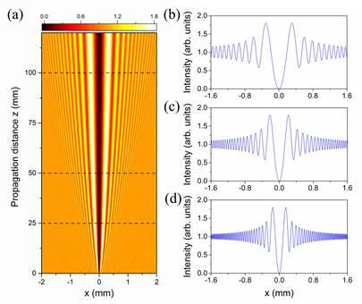 图1. (a) erf光束传播中的横向强度分布; (b)、(c) 和 (d) 分别为z=100mm、z=50mmz=25mm的横向强度分布。