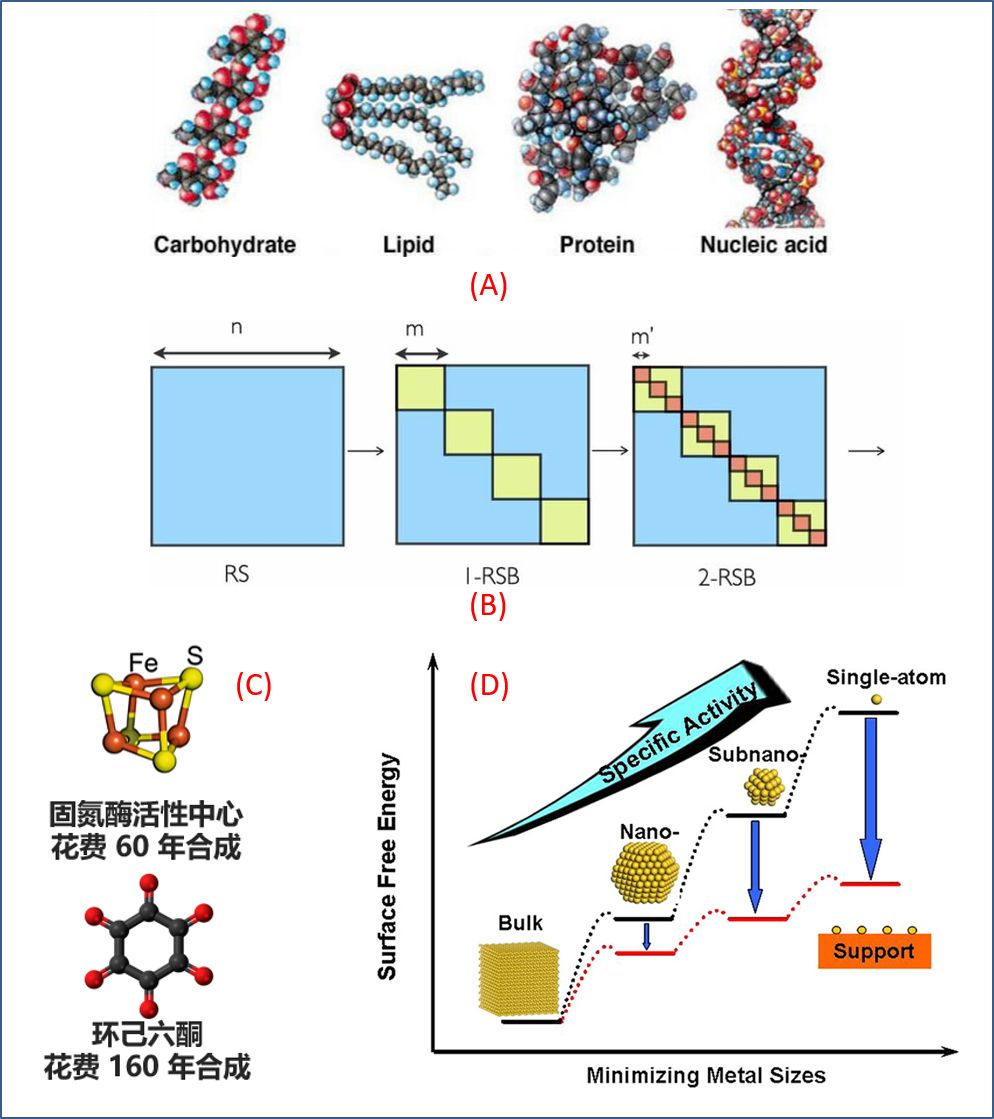 (A)四种常见的宏观生物大分子体系。相对于其中的原子而言,这些大数体系实际上表现为少子体系的行为,对理解原子制造的优势有参考价值。(B)自旋玻璃中的replicasymmetrybreaking图示;(C)在宏观大数体系中,要搜索到固氮酶活性中心分子MoFe7S9C,估计是一项艰巨而长期的工作,成功概率也很低;(D)如何从一宏观大数体系去搜索某个单原子催化剂?似乎是大海捞针,但走向原子制造似乎是正道。注意到,这些实例很好预示了原子制造方法在解决问题时的有效性、现实性。