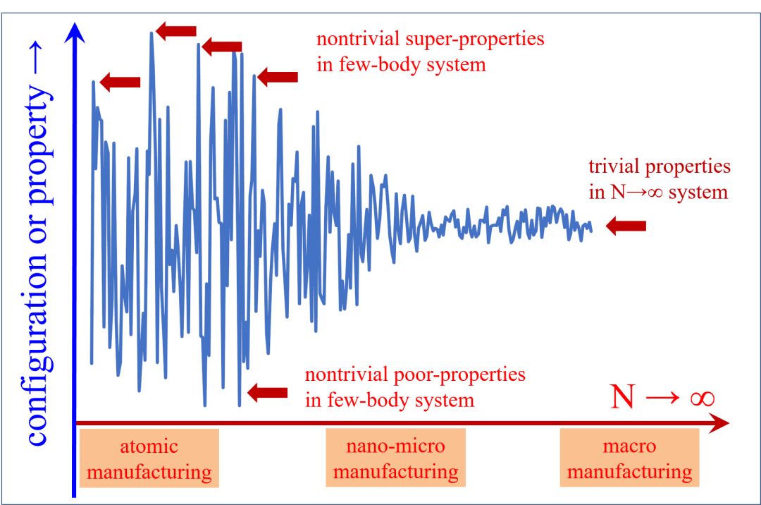 (a)这一性能,应该是热力学强度量而非广延量,例如力学强度(单位面积受力大小)。(b)对宏观材料(macro-manufacturing,宏观制造),其性能的期望值是恒定的。虽然期望值与材料加工过程和改性有一些依赖关系,但大致上变化不大。这一性能与体系各态历经进程的依赖也很小,即对组态涨落的响应很弱。(c)随N不断减小,体系走向微纳尺度(nano-micro-manufacturing),其性能与N和各态历经的依赖关系明显增大,即性能的涨落增大:有些N体系性能明显变差,有些显著提升。到达原子制造(atomicmanufacturing)时,性能对N和组态涨落的依赖变得更为剧烈,使得原子制造有机会到达一些特定组态处,那里的性能可以极为卓越,是宏观材料性能的成百上千倍(non-trivialsuper-property)。