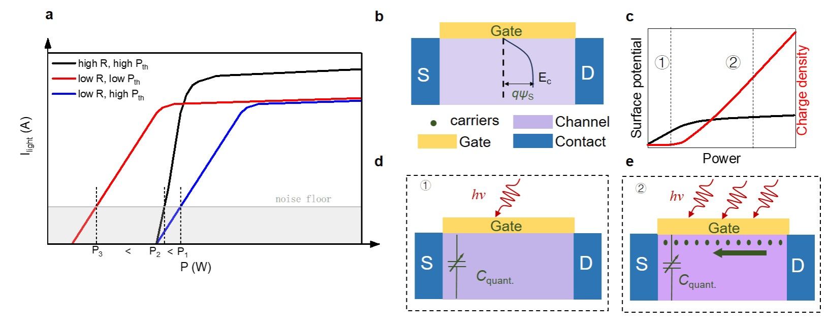 图1:光电晶体管开启阈值功率的概念与原理。a,光电探测器阈值功率示意图。两个光电晶体管的最小可探测功率由其探测率决定(P1和P2)。另一个具有优化检测极限的探测器展现出更好的阈值功率(P3),尽管其响应度(R)较低。b,光电晶体管阈值功率的起源(由源极(S)、漏极(D)和栅极定义)。c,阈值以下(区域1)和以上(区域2)的沟道电荷,箭头表示光电流方向。d,光(?ν)照射下的光电晶体管结构;e,光电晶体管沟道的表面电势和电荷密度随入射光功率的变化关系。
