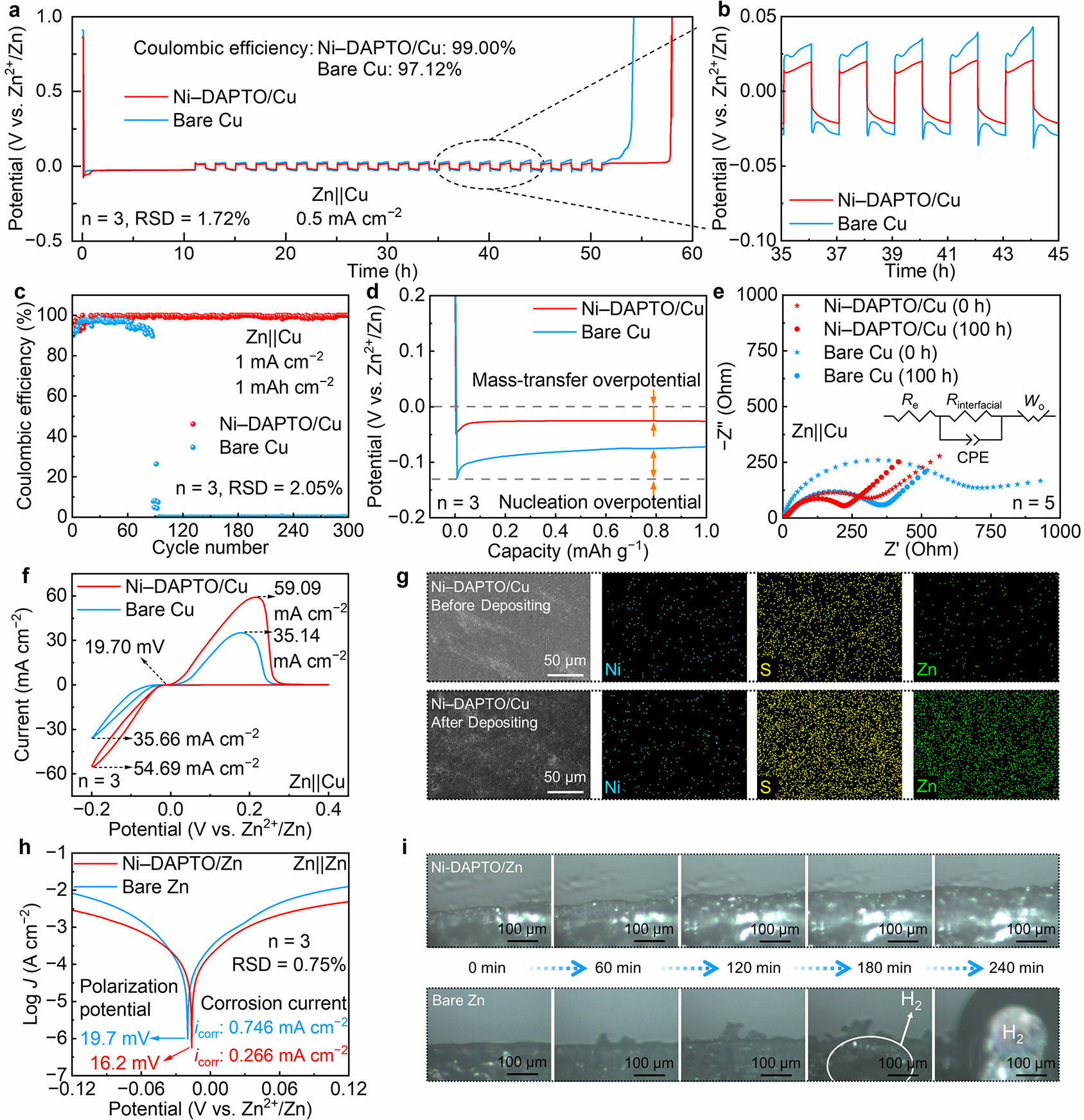 在Zn||Cu半电池和Zn||Zn对称电池中对比测试了Ni–DAPTO在负极修饰后与原始集流体和Zn负极之间的性能差异,表明Ni–DAPTO对Zn2+有良好的沉积引导作用。通过SEM和原位光学直观地观察了Ni–DAPTO作为人工SEI层的Zn枝晶抑制作用。以上都说明了Ni–DAPTO保护层在诱导Zn2+离子均匀沉积和抑制Zn枝晶生长方面发挥了关键作用。这源于Ni–CHO版块中Ni金属位点对Zn2+离子进行的选择性吸附,增强了Zn离子的电荷转移动力学,进而引导Zn离子快速、均匀的沉积。